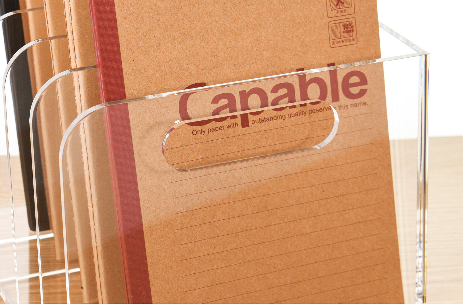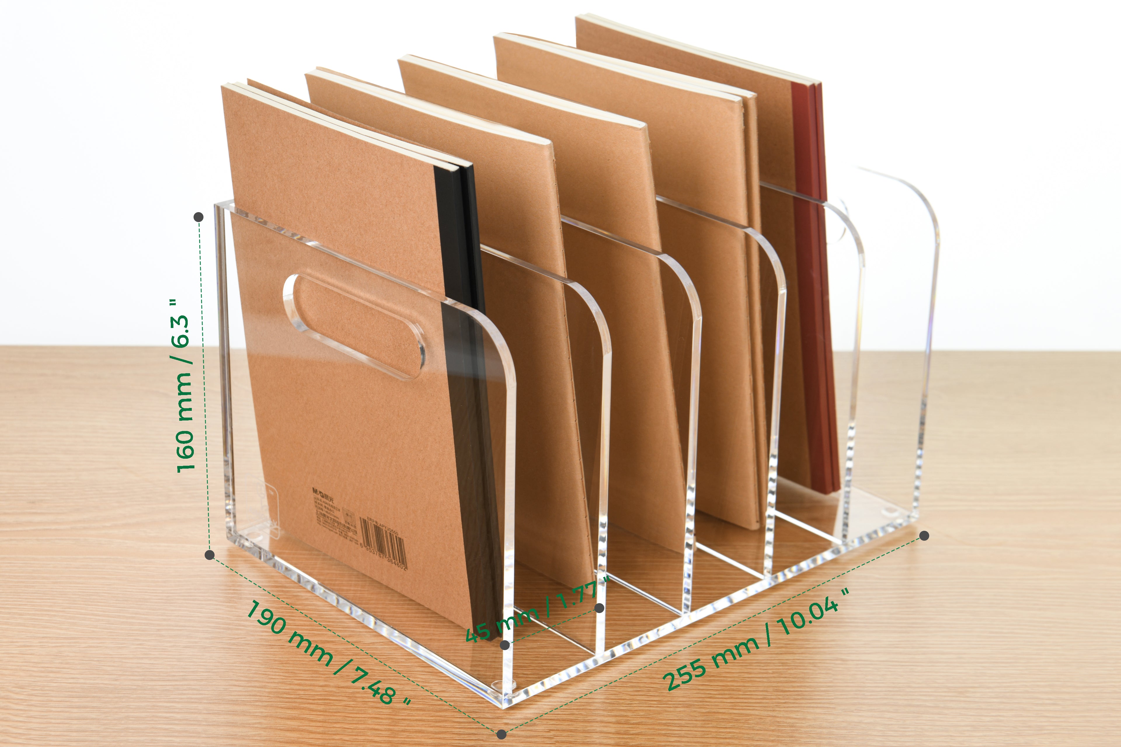 Our file racks are made of new high-quality acrylic material, which is extremely weather-resistant and UV-aging resistant. Made of 0.2 inch (5 mm) thickened acrylic, with a corner radius (R) ≥5mm to prevent hand scratches caused by friction.